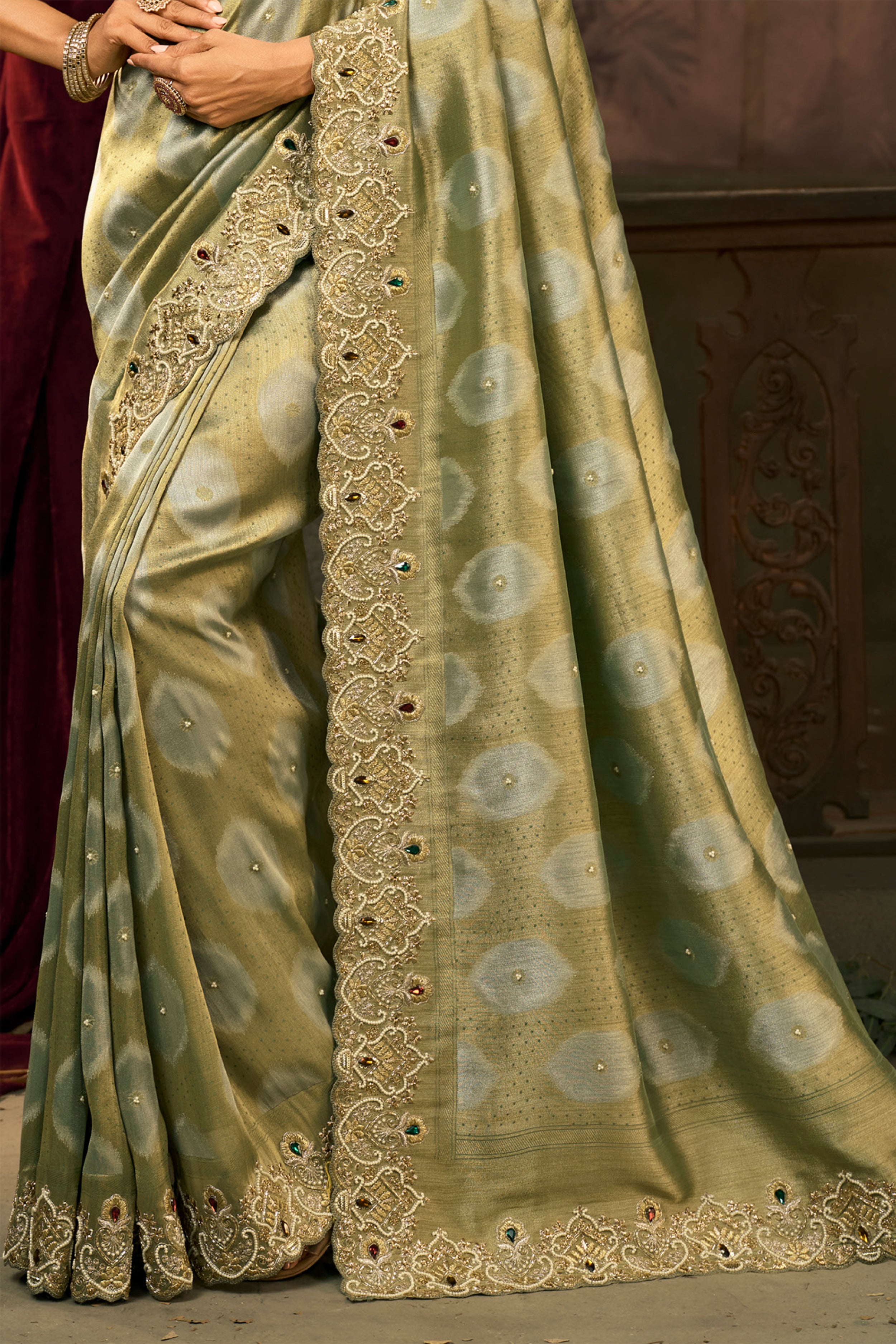 The soothing olive green tone adds a graceful and sophisticated charm, making it an ideal choice for weddings, festive occasions, receptions, and traditional celebrations