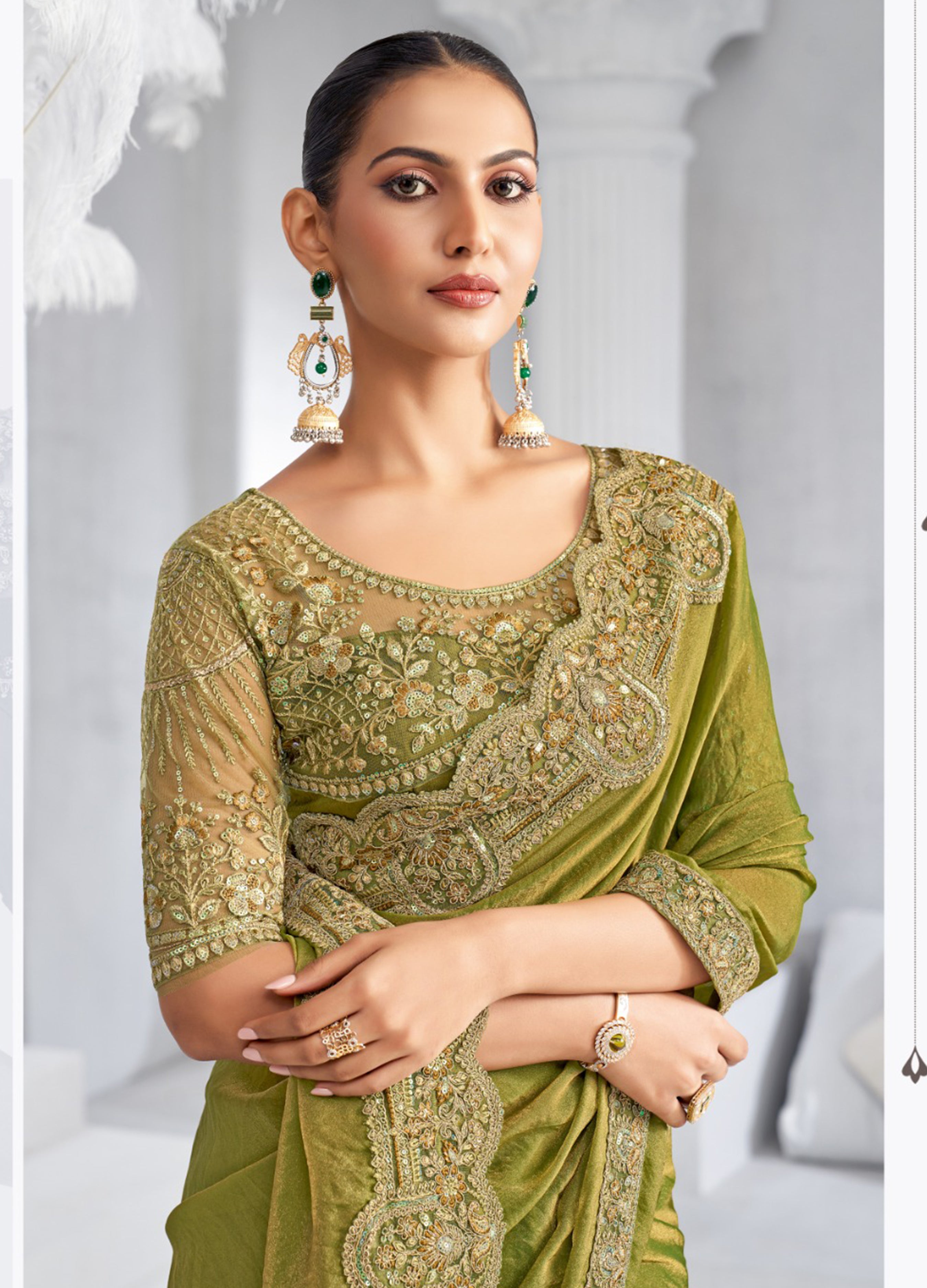 Fabric - Saree : Moss chiffon ; Blouse : Embroidered.