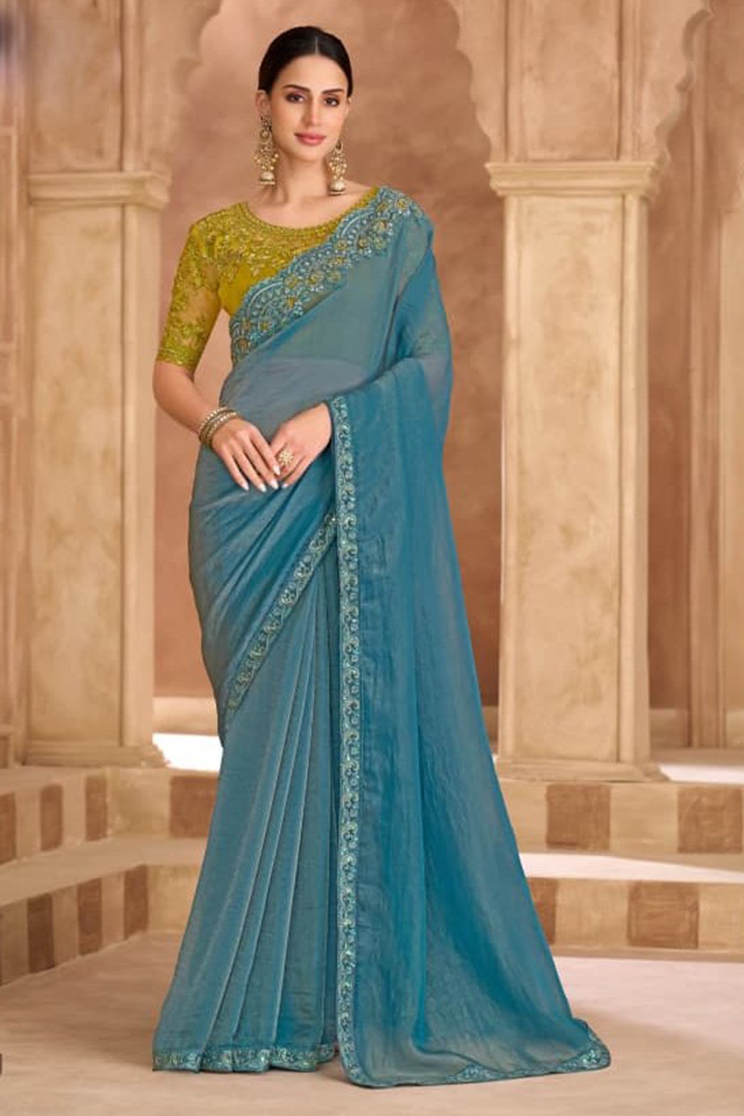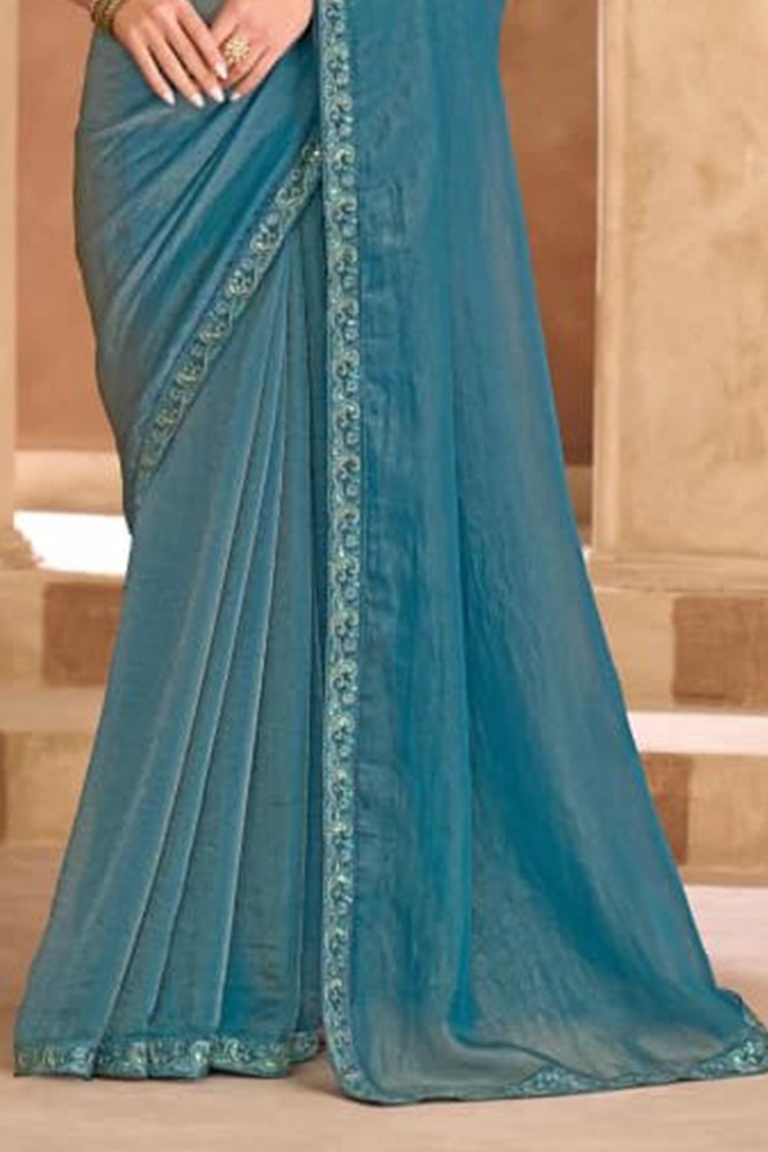 Drape yourself in timeless elegance with this stunning sky blue georgette saree from Peachmode. This saree features delicate sequin and thread embroidery, adding a touch of shimmer and sophistication to your look