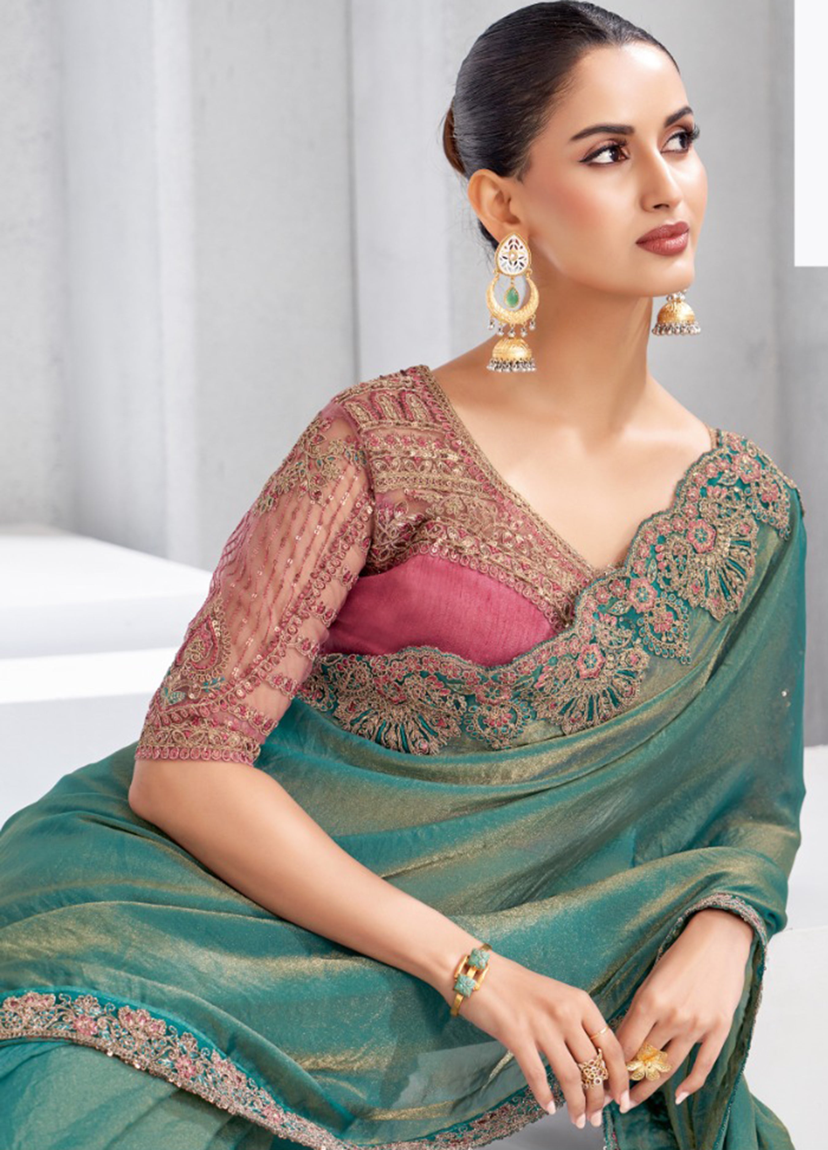 Teal Mint Moss chiffon Saree with Embroidered Blouse