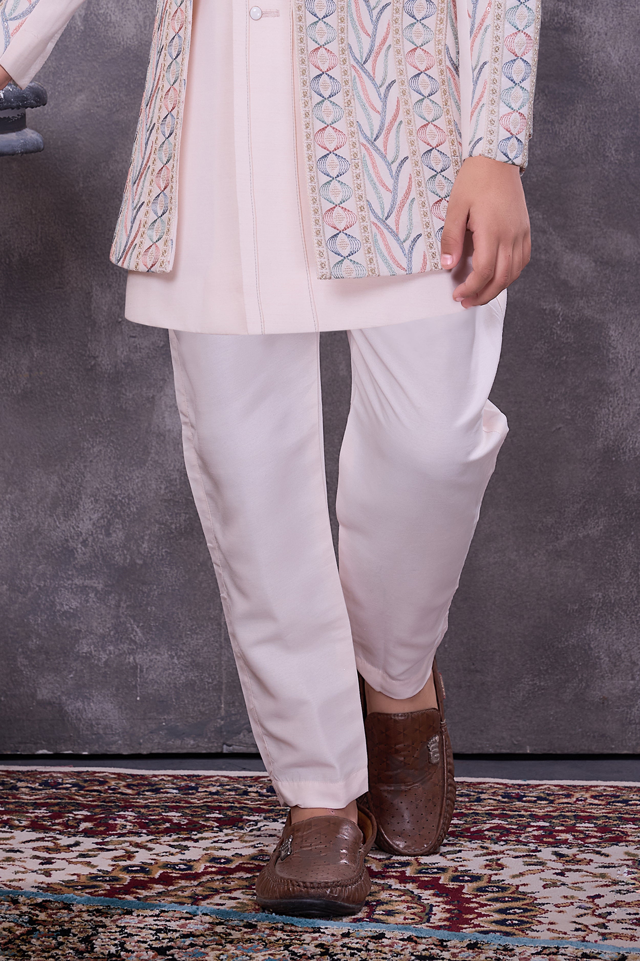 Rendered in soothing light pink jacquard, this boys festive outfit features sparkling sequins interwoven with delicate thread accents