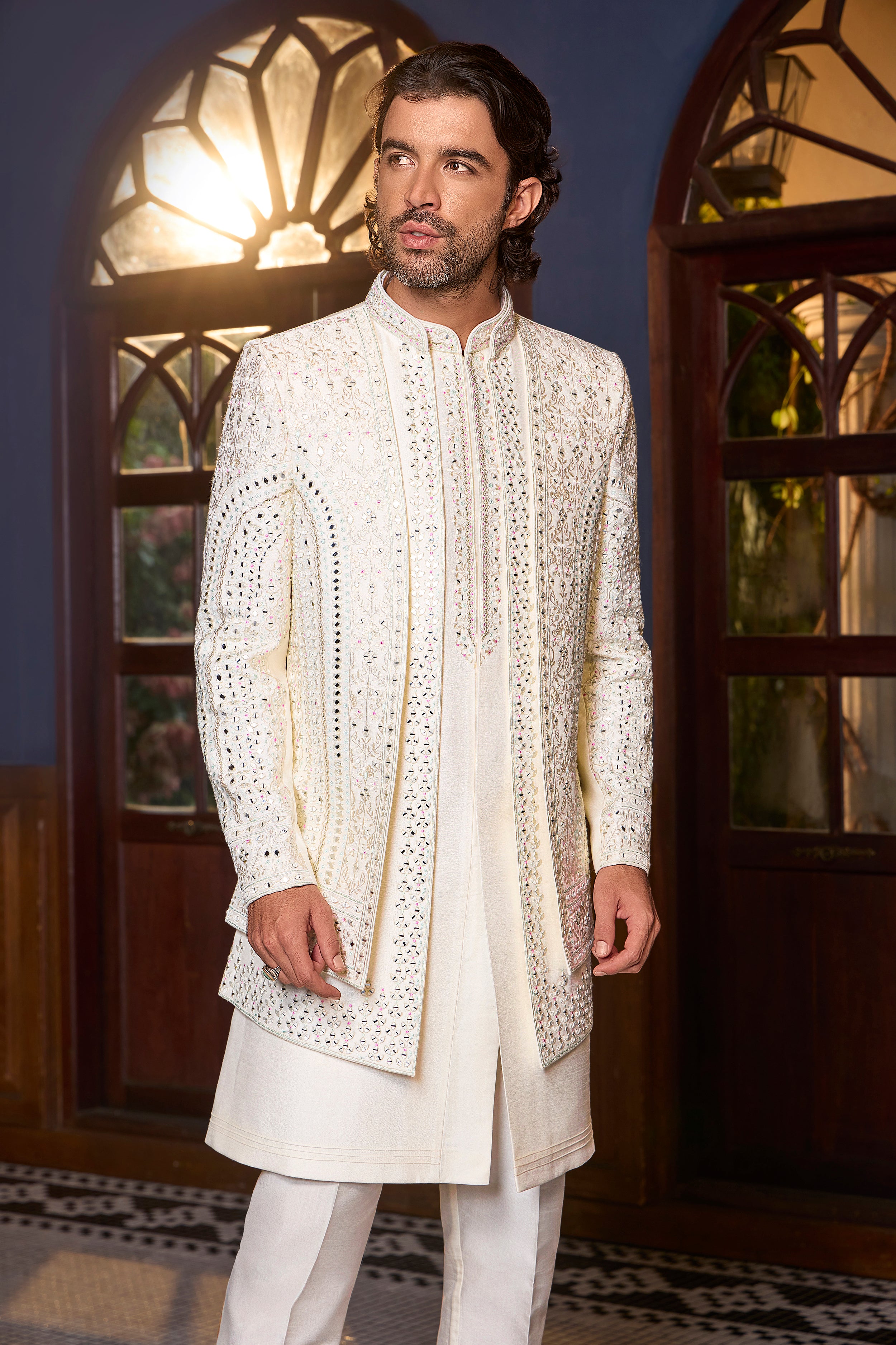 Step into timeless elegance with this exquisite Ivory Silk Indo-Western, crafted for those who love luxurious style without overspending.
