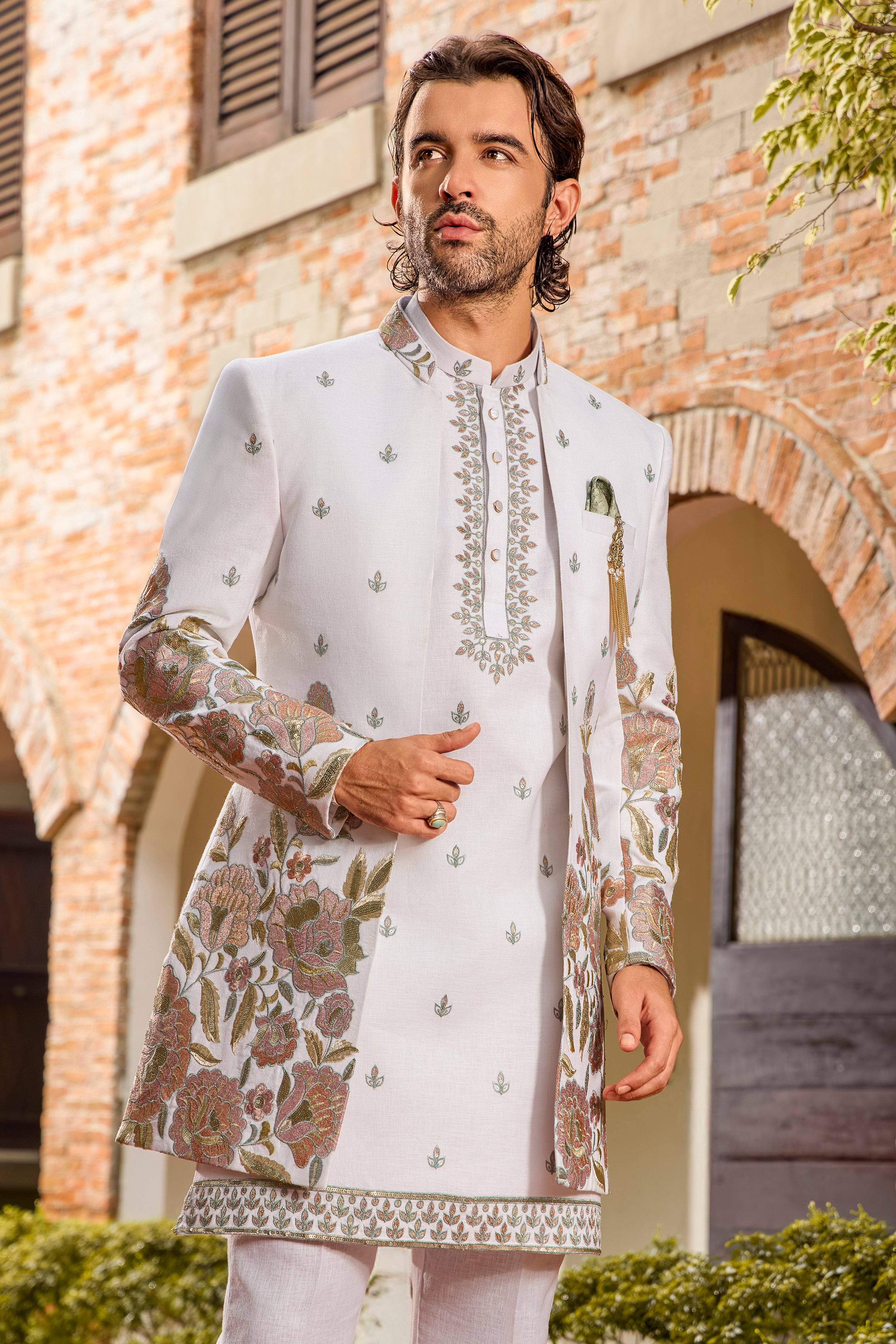 Wrapped in a soft ivory base, the outfit blossoms with intricately embroidered florals along the sleeves, hem, and panels — reminiscent of a hand-painted garden at dawn.