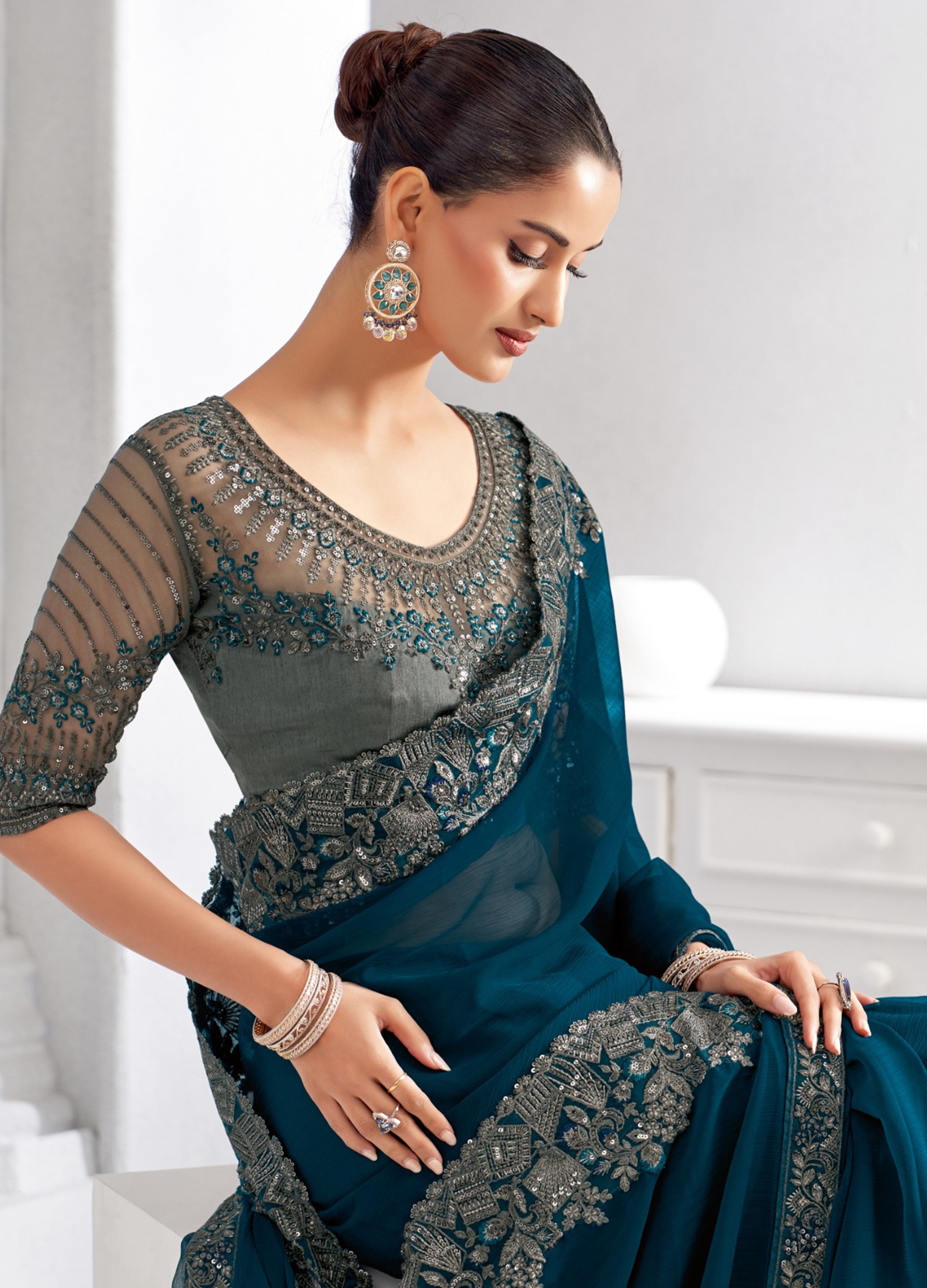 Teal Blue Trim Chiffon Saree with Embroidered Blouse