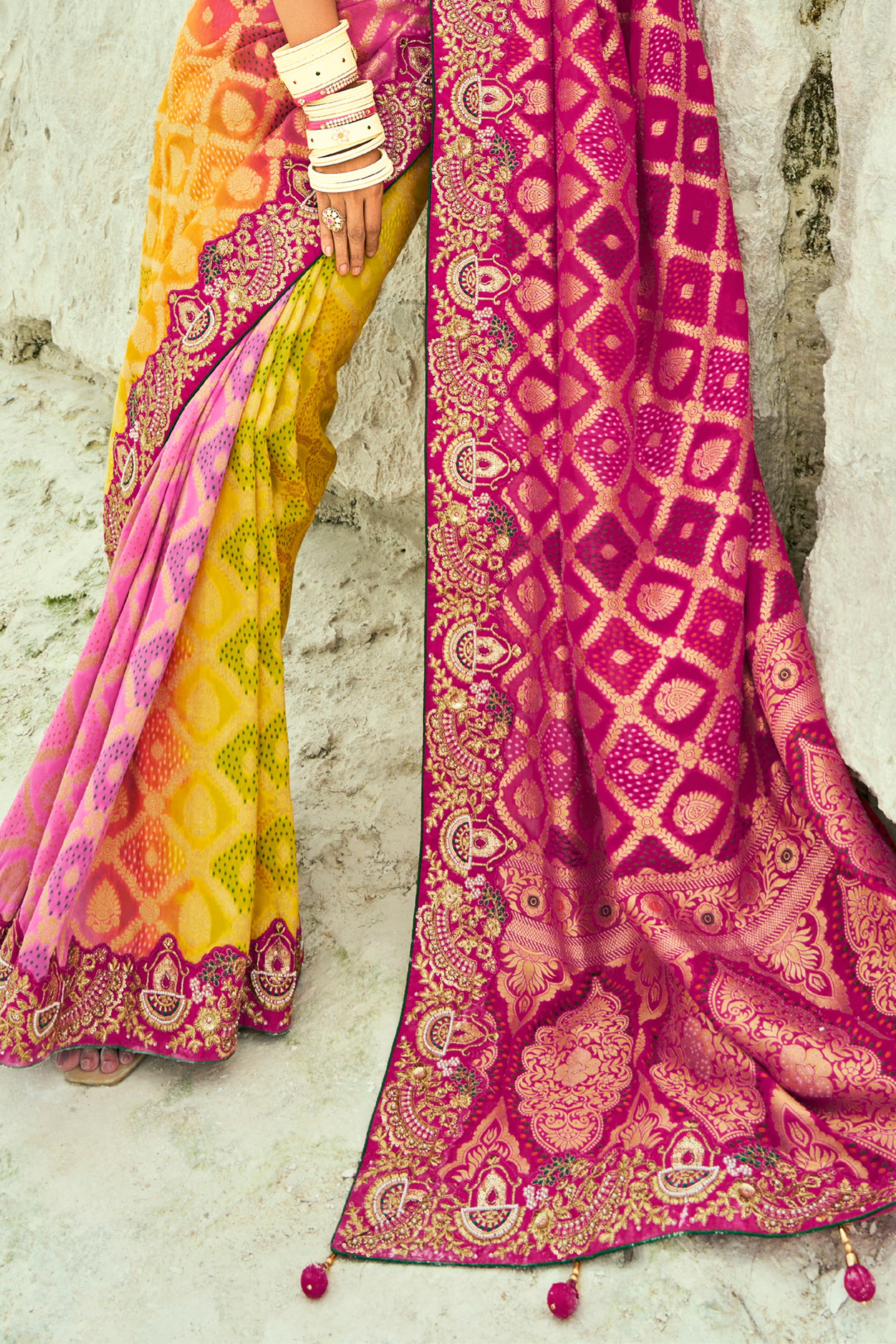 - Experience traditional magnificence with this stunning Mustard Rani Georgette Bandhej Designer Saree by Empress.
