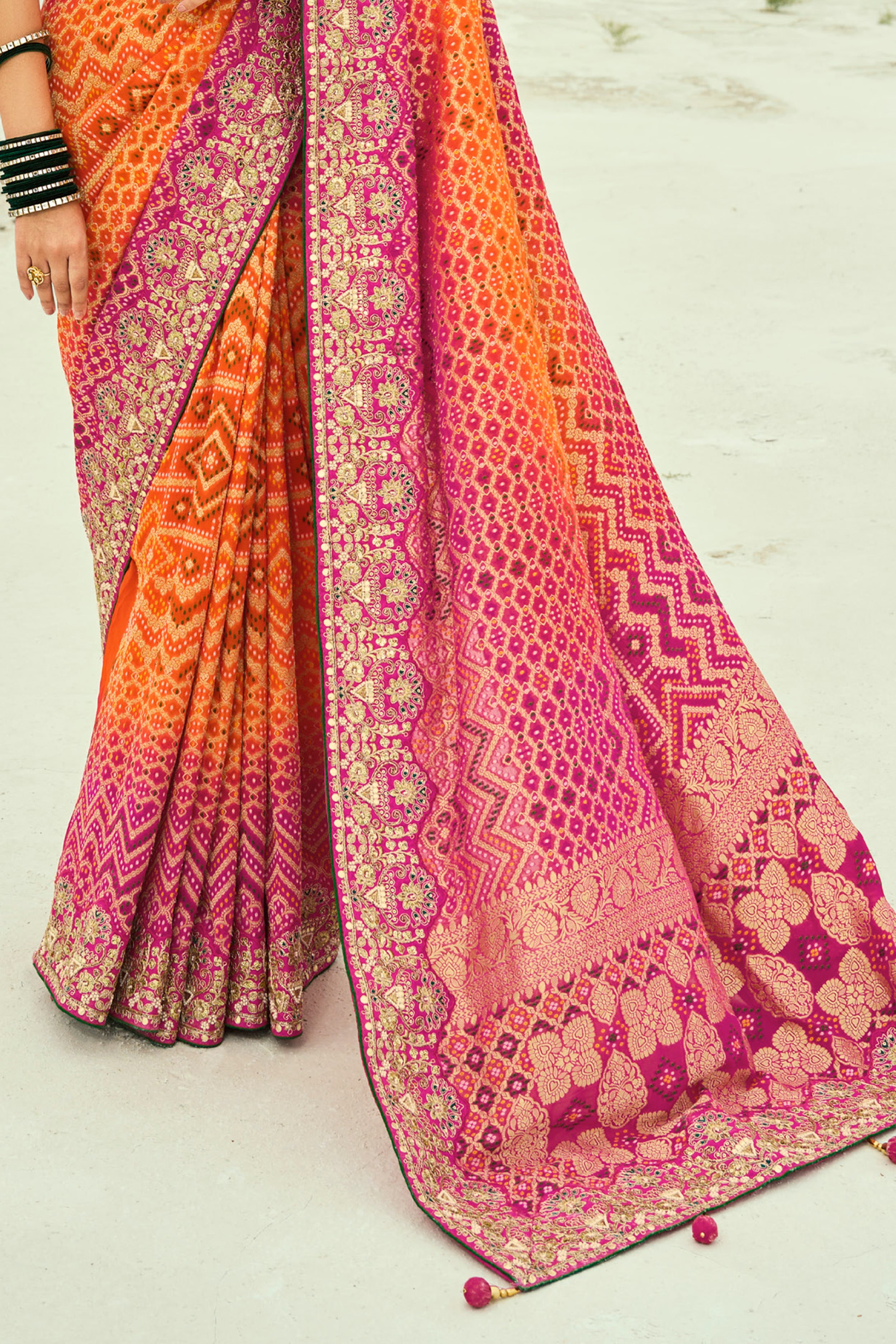 Orange And Rani Embroidered Pure Georgette Jacquard Saree