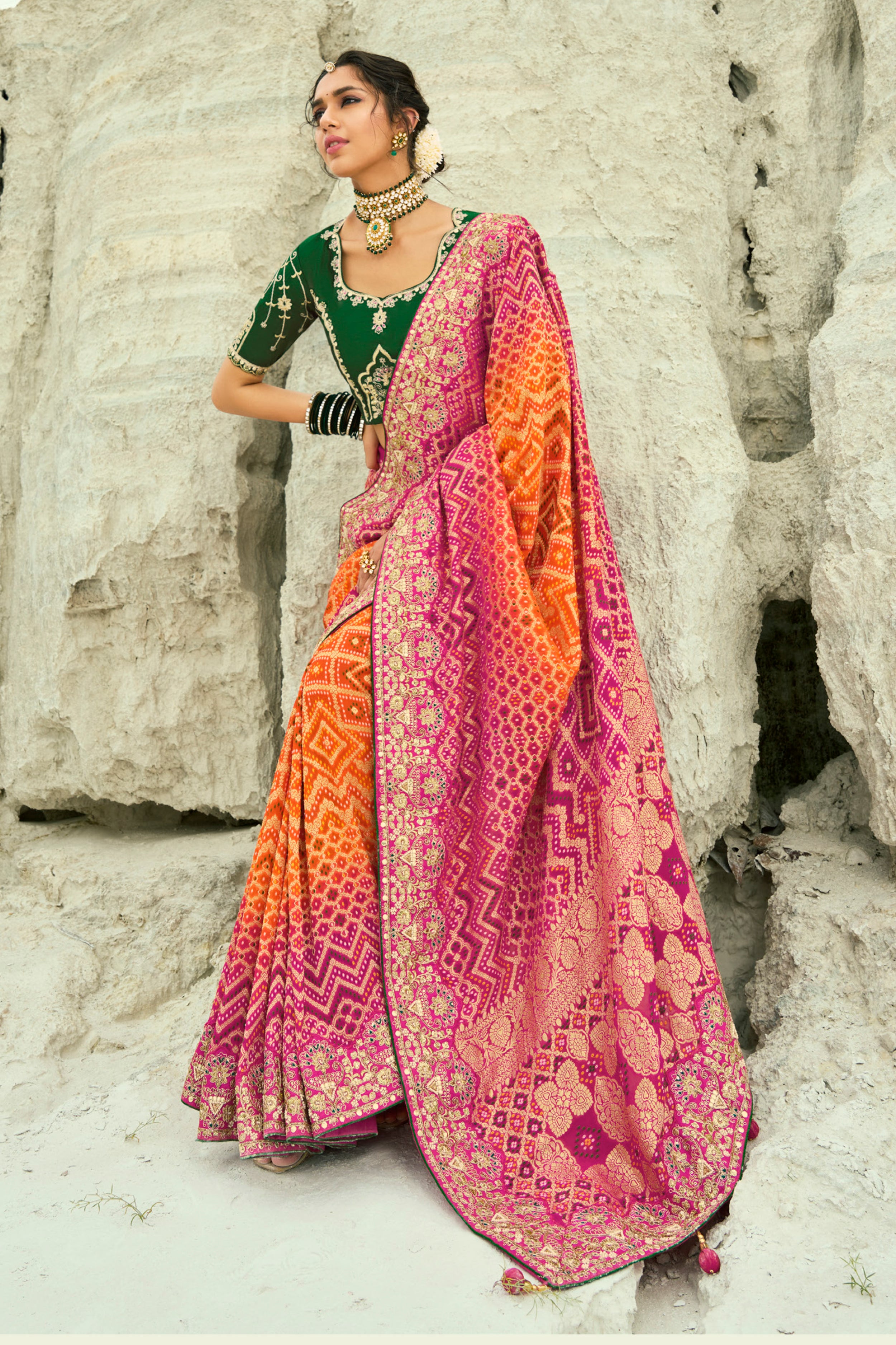 • Make a glam style statement wearing this gorgeous orange and rani color Pure Georgette Jacquard Saree, that's perfect for wedding festivities