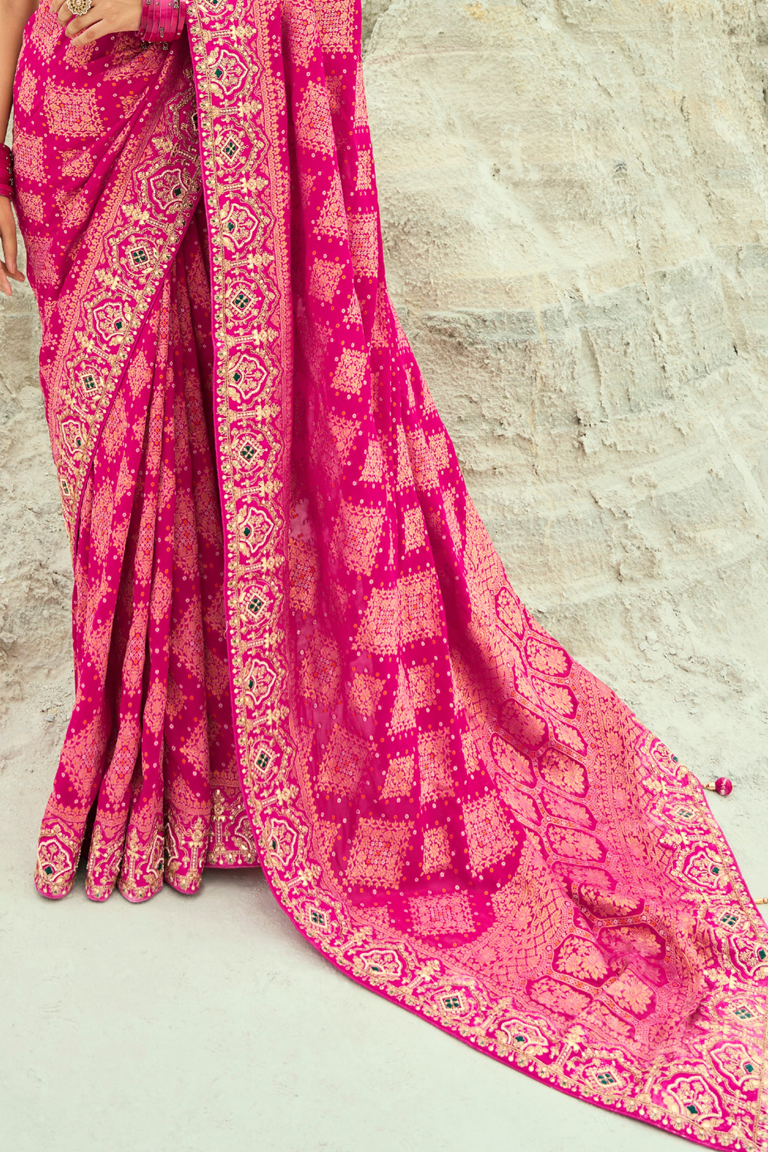 - The shimmering drape is beautified with thread, sequins, pearl and cutdana embroidery work.