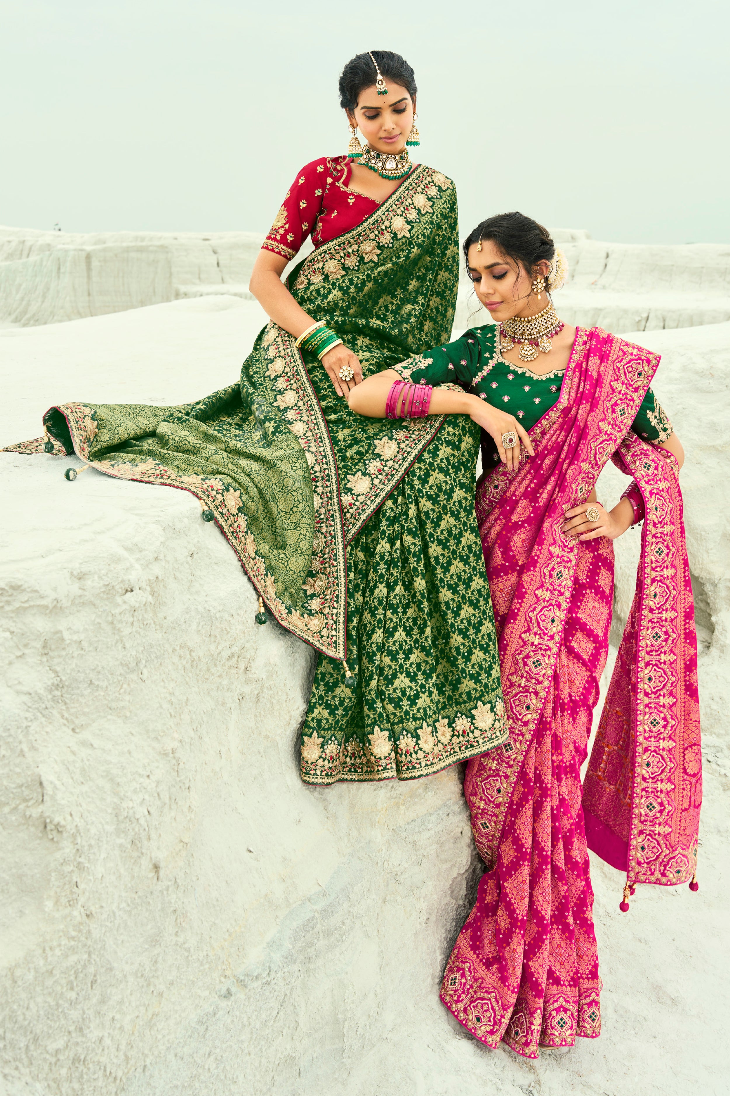 - Available with a Semi-stitched V Neck and Half Sleeves Embroidered Art Dupion Silk Blouse in Dark Green