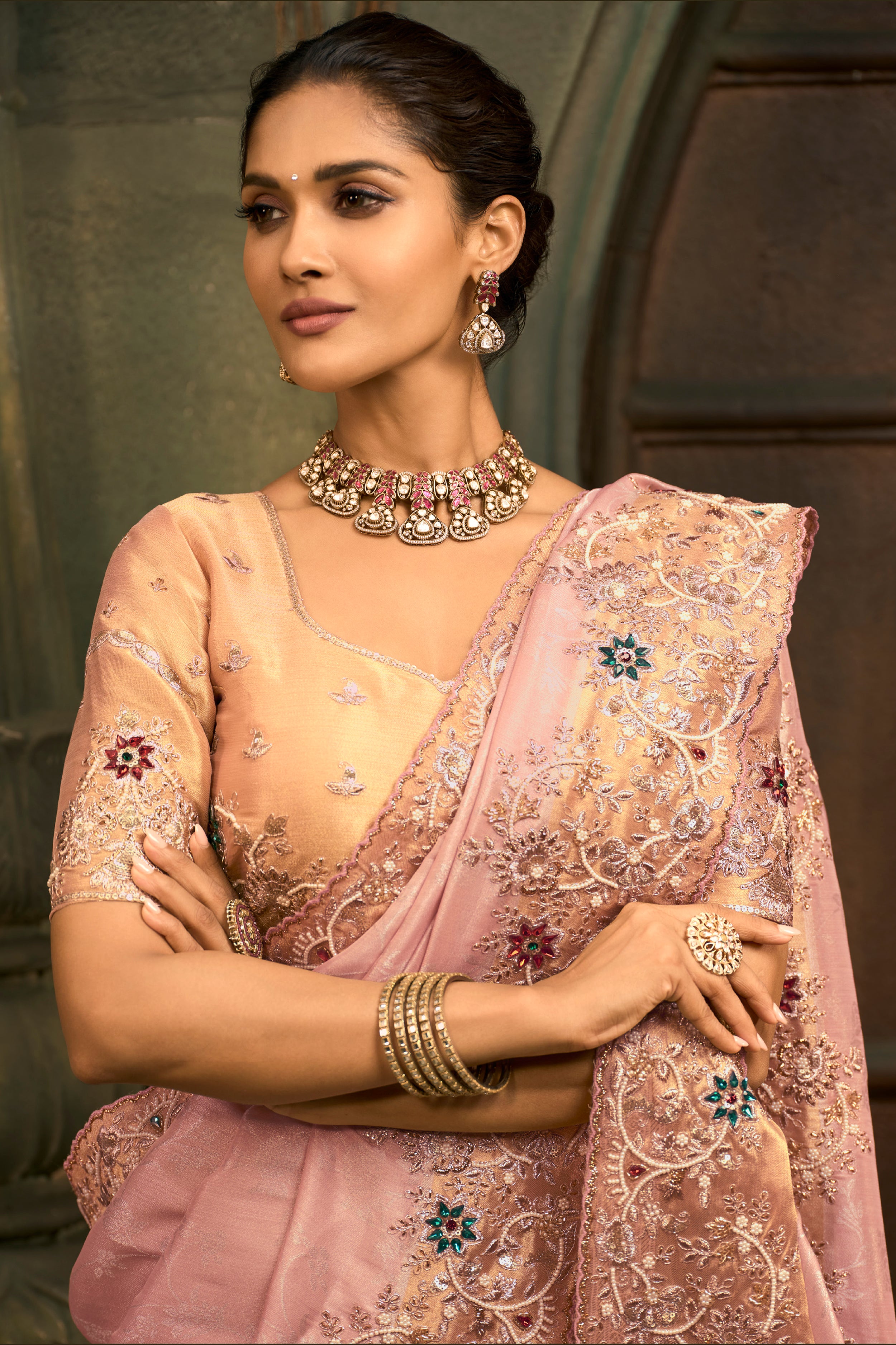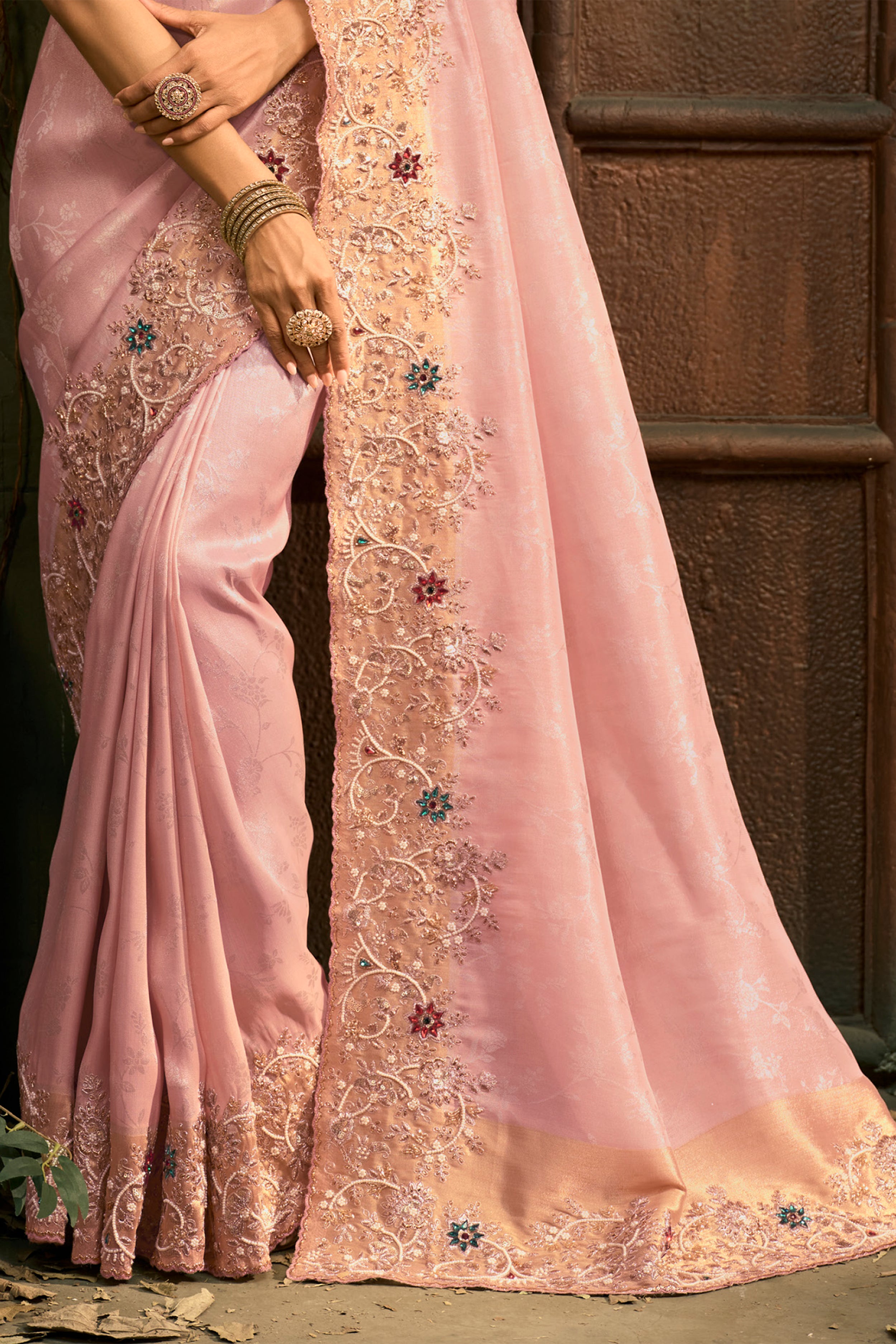 Pink Designer Embroidered Silk Saree with Floral Work Wedding Wear
